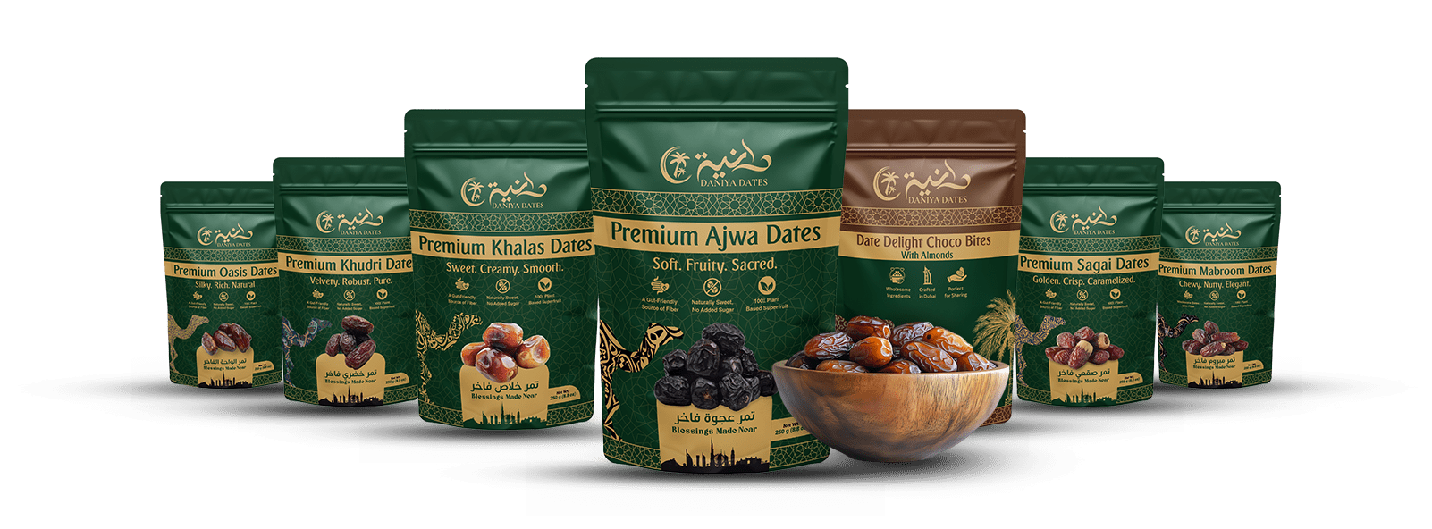 Daniya offers the world’s widest variety of premium dates, organized into four distinct categories—Oasis, Indulgence, Ingredients, and Spiritual ranges . From everyday snacking to spiritual rituals, gourmet indulgence, and cooking essentials, we provide every size, type, and packaging solution—pouches, boxes, or specialty packs—under one trusted umbrella.
